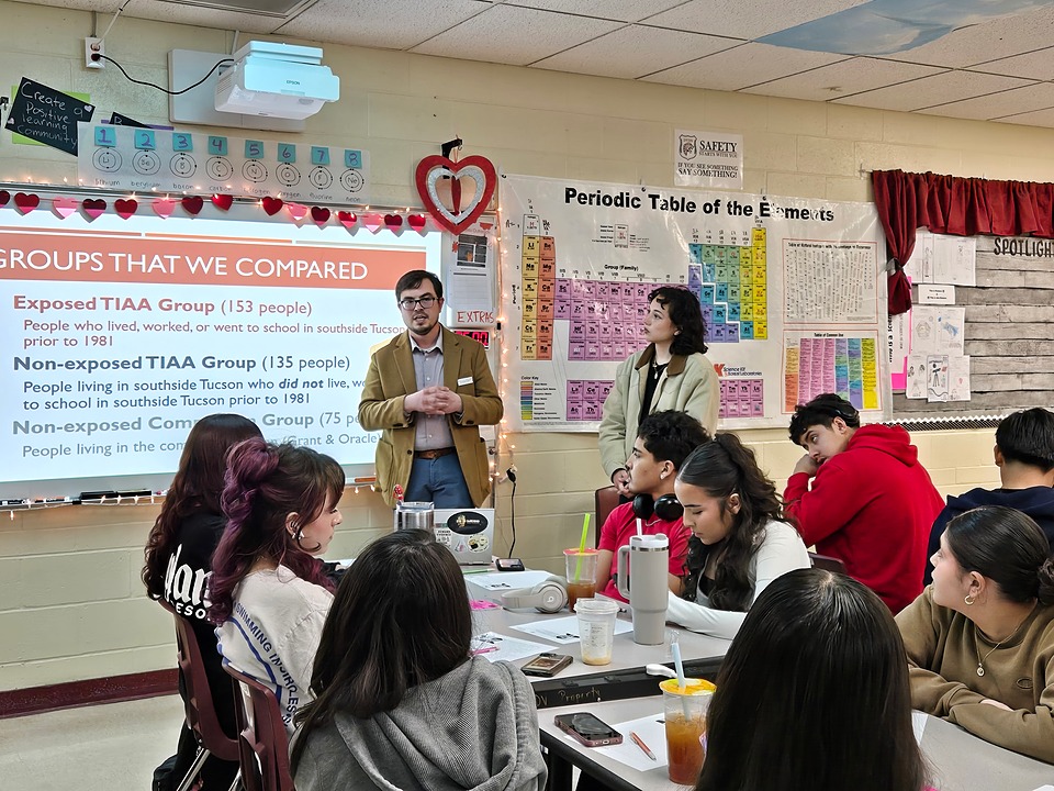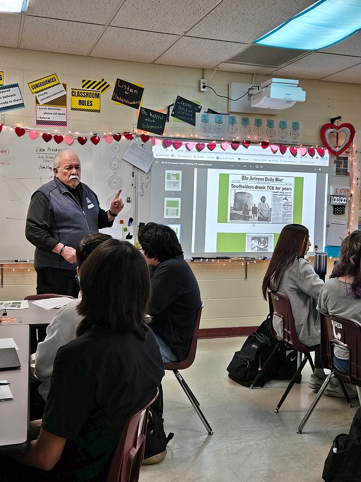 First, community members visited their classroom to share personal stories of how their community and families were impacted, including Rick Gonzales, a community resident and lawyer who successfully represented hundreds of residents affected by TCE in a mass tort lawsuit. Students also met with community leader Rebecca Quintero, a Sunnyside Unified School Governing Board member who shared personal and community stories and answered students’ burning questions. “Students were on the edge of their seats. They were asking questions, not because I told them to or because I expected them to. They were genuinely curious and just wanted to know more,” Lopez reflected. The conversations were illuminating to students, many of whom were previously unaware of the impact of TCE, which still impacts the community today 40 years later. Rick Gonzales reinforced that message when he told the students, “This is your legacy now.”